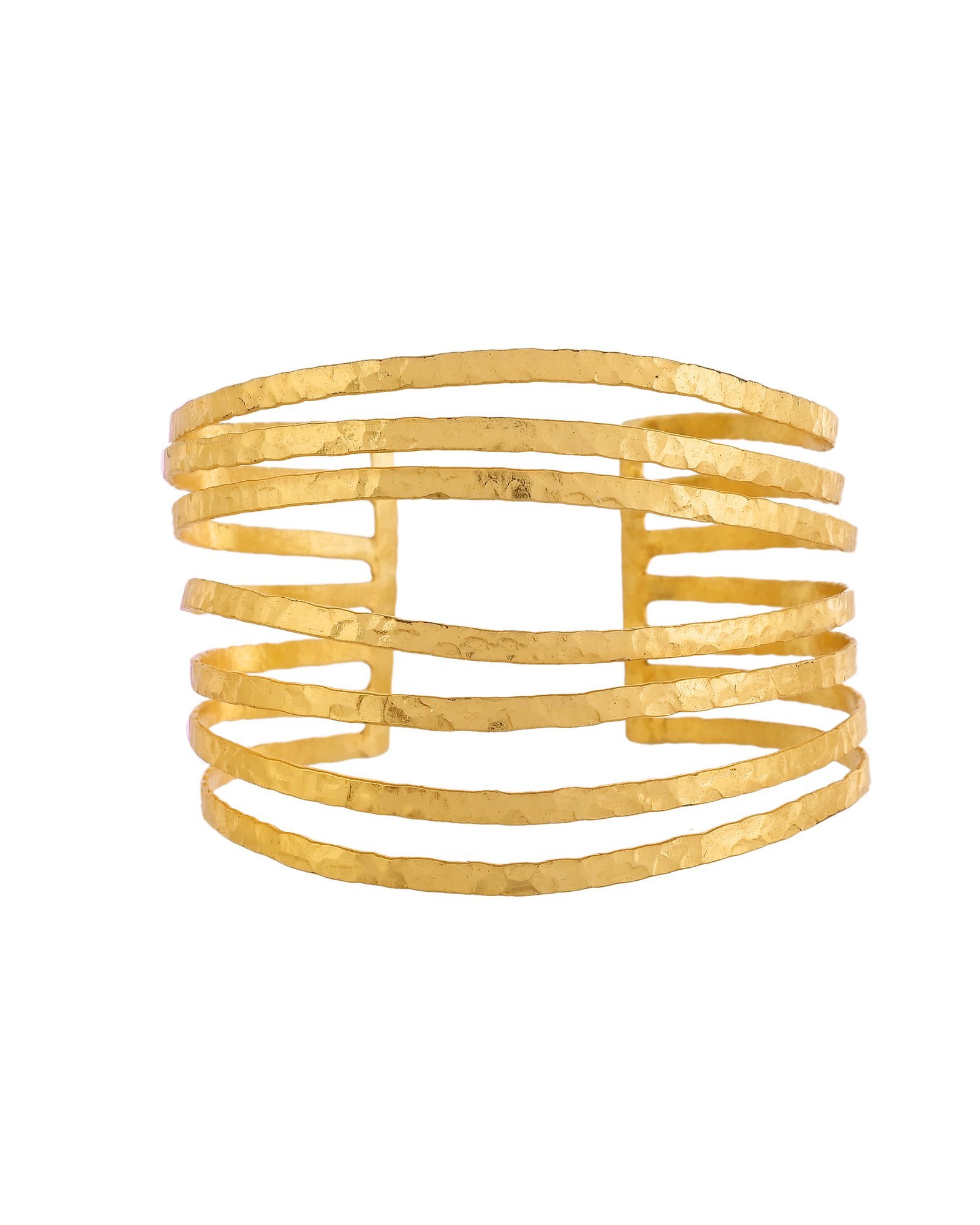 - Multiple parallel textured gold bands curve into a wide open cuff with bold structure