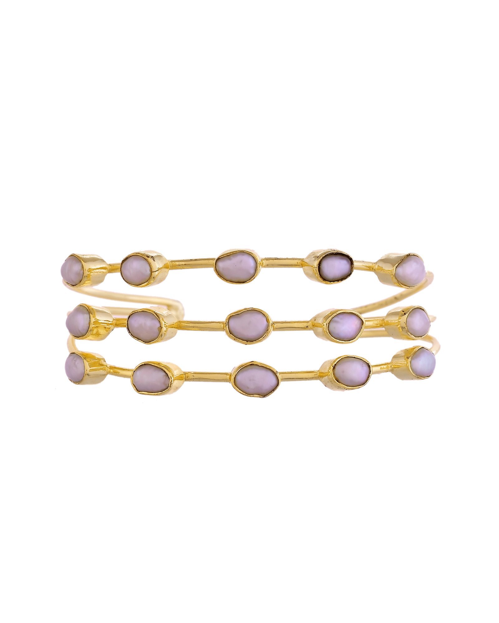 - Three parallel gold bands form a structured bangle, each set with opalescent oval stones